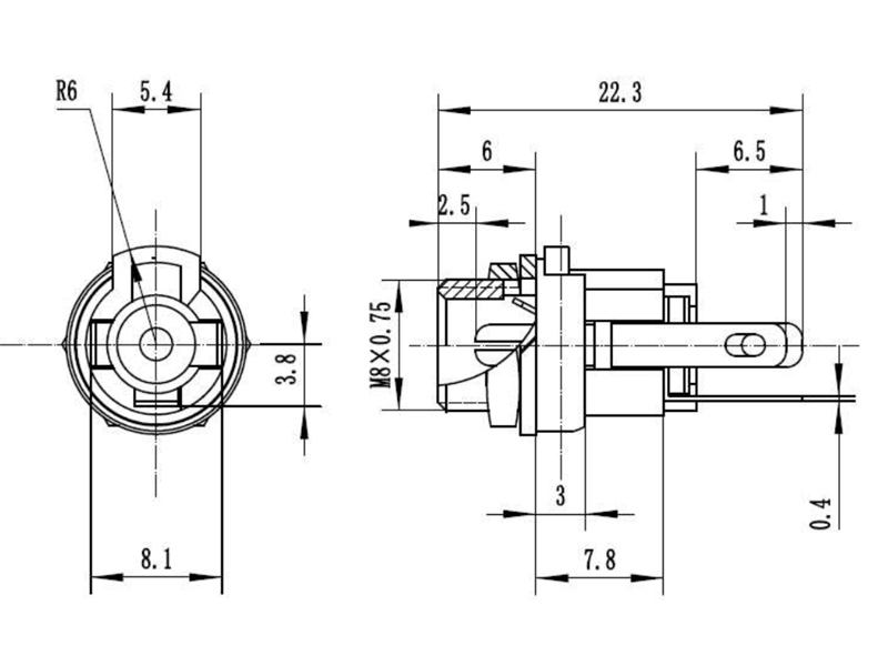 Simple DC plug with thread and nut that is mounted in a 8mm hole, for example in an enclosure. There are solder terminals for connecting.