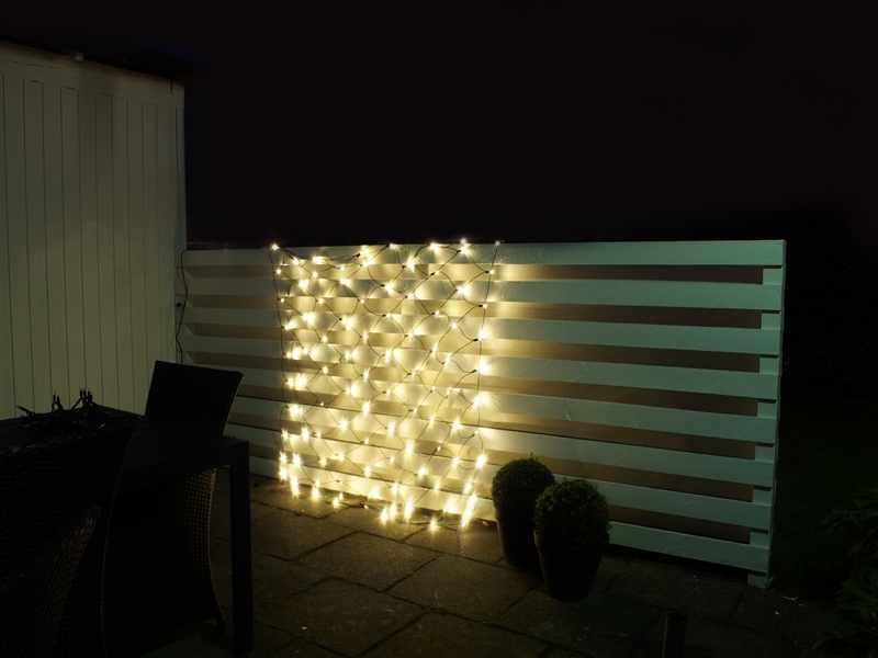 A strong net with 100 LEDs, braided in to a square with 10 x 10 LEDs with measurements of 1,5 x 1,5 m. The 10 rows of the LEDs are shifted, which gives a great distribution og the light. The light has a color temperature of 2700K, which is equivalent to incandescent.