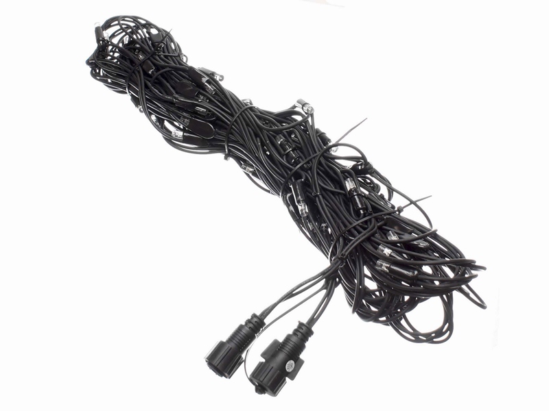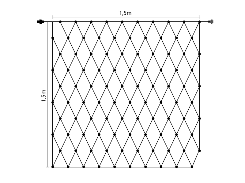 A strong net with 100 LEDs, braided in to a square with 10 x 10 LEDs with measurements of 1,5 x 1,5 m.