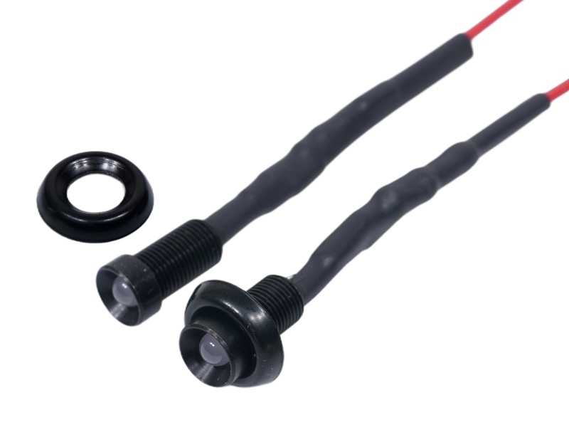 The 5mm diode is built into a metal bushing with threads, so that you can screw the LEDs in panels etc. They are mounted in a 9mm hole and need 10mm space at the back. The special washer is included, and is typically used when replacing a plush-button.