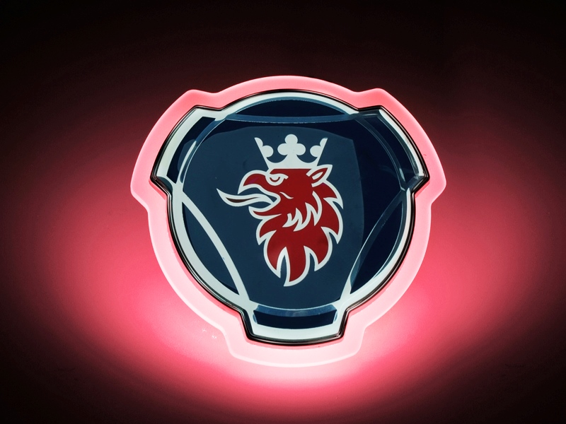 Waterproof Scania emblem with LED edge/outline. Depending on the chosen model, the base can be made of clear or specially frosted white acrylic illuminated by LEDs.